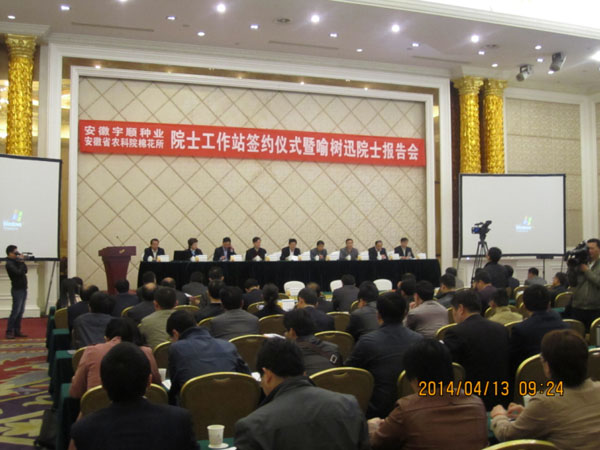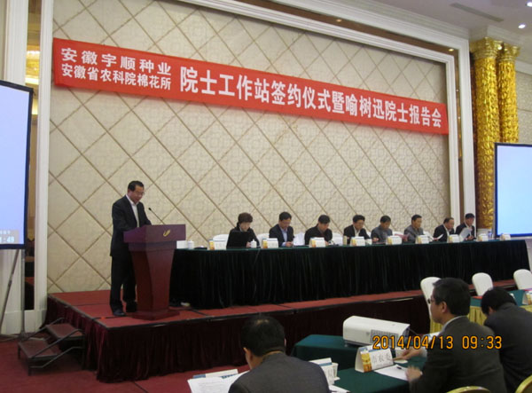 2014年4月13日上午,由中國(guó)工程院喻樹(shù)迅院士與安徽宇順?lè)N業(yè)開(kāi)發(fā)有限公司、安徽省農(nóng)科院棉花所共建成立的“棉花院士工作站”簽約儀式在安慶碧桂園鳳凰酒店舉行,標(biāo)志著全市首家農(nóng)業(yè)院士工作站簽約成立。中國(guó)農(nóng)科院棉花所研究員、中國(guó)工程院院士喻樹(shù)迅,安徽省農(nóng)科院院長(zhǎng)楊劍波以及省農(nóng)業(yè)機(jī)械推廣總站、省農(nóng)科院棉花所、國(guó)家棉花長(zhǎng)江試驗(yàn)站等部門(mén)的領(lǐng)導(dǎo)專(zhuān)家出席簽約儀式。市農(nóng)委、市科技局、市財(cái)政局,有關(guān)縣區(qū)農(nóng)委(農(nóng)業(yè)局)負(fù)責(zé)人和相關(guān)技術(shù)人員參加簽約儀式。簽約儀式由市政府副秘書(shū)長(zhǎng)張仕慶主持。市政府副市長(zhǎng)張小青在儀式上指出,安慶農(nóng)業(yè)基礎(chǔ)較好,是國(guó)家農(nóng)業(yè)部確定的棉花優(yōu)質(zhì)生產(chǎn)區(qū)域,現(xiàn)已發(fā)展為全國(guó)棉花紡織精品生產(chǎn)基地,我市的望江縣和宿松縣是全國(guó)著名的棉花百?gòu)?qiáng)縣。他強(qiáng)調(diào),院士工作站的成立契合我市農(nóng)業(yè)領(lǐng)域正在實(shí)施的“5211”工程,必將進(jìn)一步提升我市棉花生產(chǎn)儲(chǔ)運(yùn)能力和科技科研水平,為實(shí)現(xiàn)我市乃至我省棉花生產(chǎn)方式的根本變革提供技術(shù)支撐,也必將推進(jìn)我市農(nóng)業(yè)產(chǎn)業(yè)化整體水平。