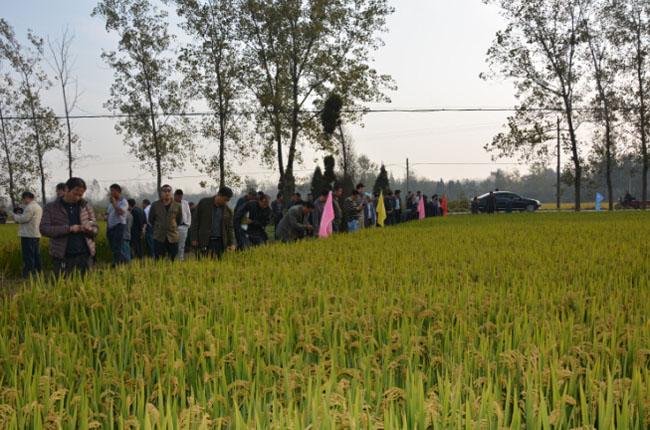 來(lái)自全省28個(gè)縣的120位代理商及部分種植大戶共同參觀了位于舒城杭埠鎮(zhèn)的種植現(xiàn)場(chǎng),實(shí)地觀看武運(yùn)粳29號(hào)的田間表現(xiàn),紛紛夸贊該品種分蘗能力強(qiáng)、結(jié)實(shí)率高、穗型大、產(chǎn)量高、熟相好。特別是武運(yùn)粳29號(hào)經(jīng)受了今年低溫陰雨寡日照氣候的考驗(yàn),表現(xiàn)出抗倒、抗病和抗逆性強(qiáng)的特點(diǎn),增強(qiáng)了與會(huì)代表下年度大力推廣的信心。
