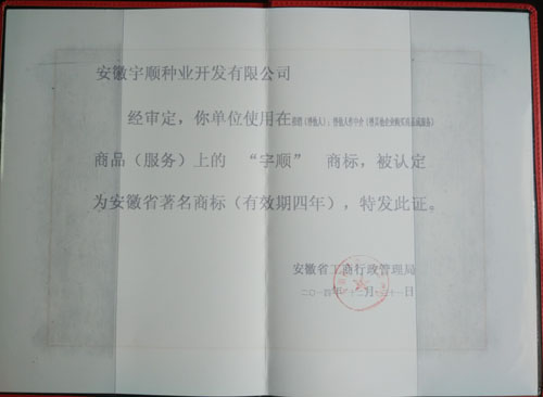 經(jīng)安徽省工商行政管理局審核,我公司“宇順”商標于2014年12月31日被審定為“安徽省著名商標”。