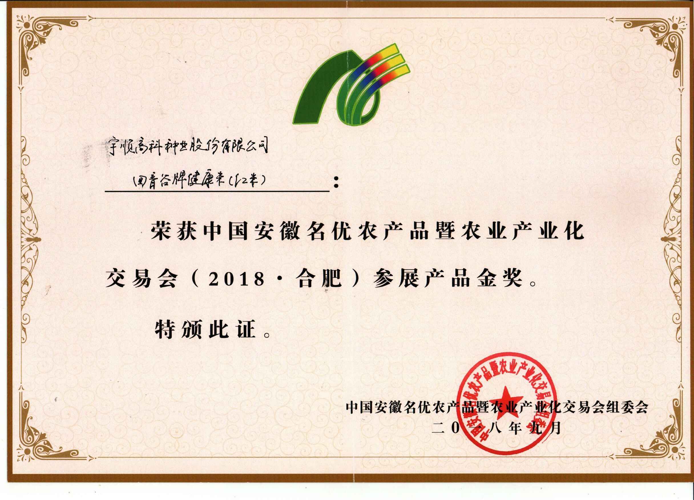 我司回音谷牌健康米(紅米)榮獲中國安徽名優(yōu)農(nóng)產(chǎn)品暨農(nóng)業(yè)產(chǎn)業(yè)化交易會(2018·合肥)參展產(chǎn)品金獎。