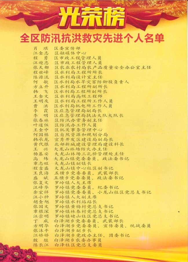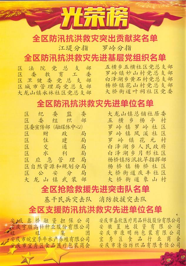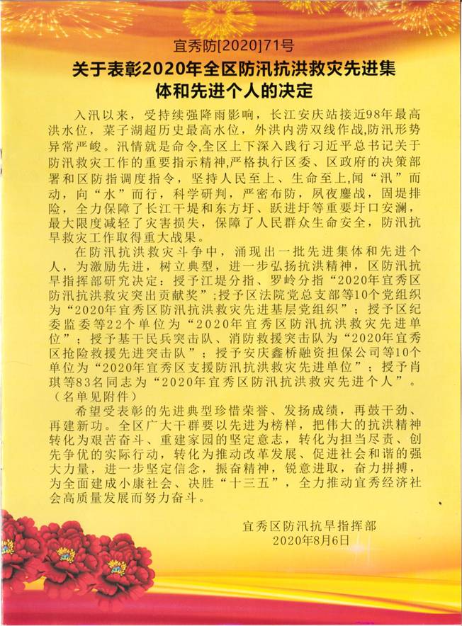 2020年8月8日,在安慶一中(龍山校區(qū))多媒體會議室召開了“2020年全區(qū)防汛抗洪救災先進基地和先進個人”表彰大會,區(qū)委、區(qū)政府,各委辦局、各鎮(zhèn)街,受表彰先進集體主要負責人、受表彰先進個人參加會議。會上,與會人員觀看了防汛抗洪救災紀錄片,區(qū)委書記婁雪松宣讀了表彰決定。